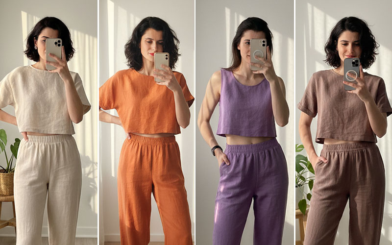 “Minimalist bir yatak odasında, çerçevesiz uzun bir aynanın karşısında çekilmiş tam boy bir selfie. Yüz, orijinal yüzün %99 aynılığıyla korunacak (yüzde hiçbir değişiklik yapılmayacak). İnce yapılı, genç, esmer bir kadın; açık bej renkli keten iki parçalı bir loungewear takımı giyiyor: kısa crop üst ve bol paça pantolon. Sol eli telefonu tutarken, sağ eli hafifçe kalçasının üzerinde duruyor. Altın saat ışığı, tül perde arasından odaya süzülüyor ve arka duvara sıcak, çizgisel gölgeler düşürüyor. Zeminde dokuma jüt halı var ve yanında saksı bitkisi bulunan alçak ahşap bir tabure bulunuyor. Görüntü keskin, ten tonu doğal, hafif alan derinliği etkisi mevcut. iPhone 14 Pro geniş açı kamera ile çekilmiş gerçekçi sabah–golden hour estetiği.”