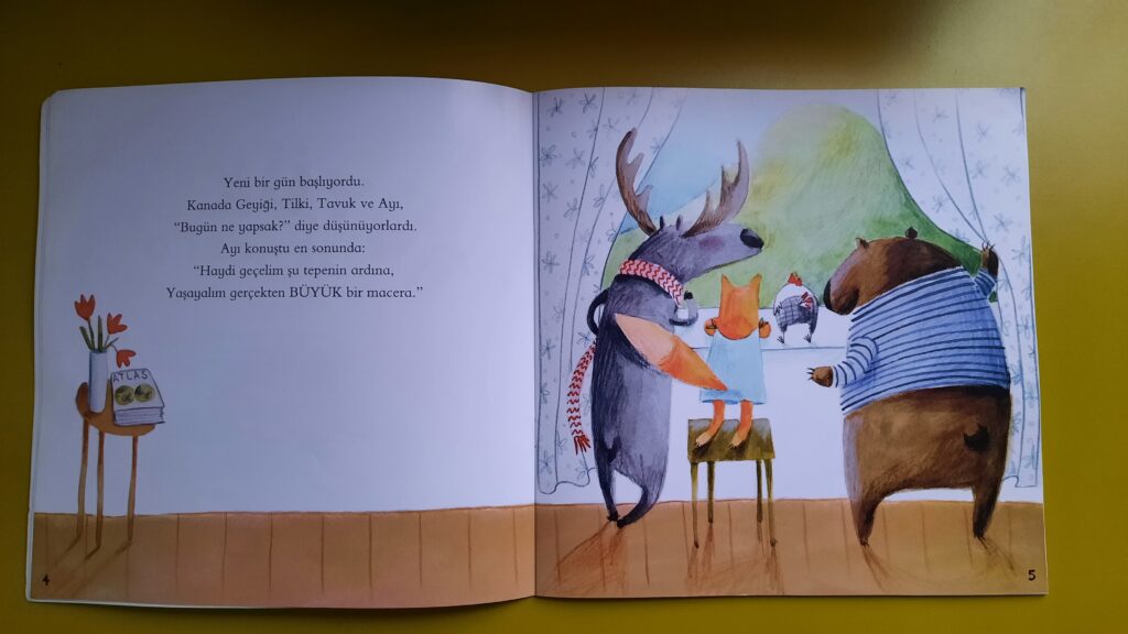 Her biri farklı bir hayal ve beklentiyle yola çıkmak isteyen Geyik, Tilki, Ayı ve Tavuk arkadaşlar kitabımızın kahramanları. Kimi keşif istiyor, kimi hız, kimi rahatlık, kimi de heyecan. Büyük bir macera yaşamak için ortaya attıkları fikirler birbirinden o kadar farklı ki bazen ufak tefek anlaşmazlıklar olabiliyor. Ancak birlikte öyle güzel hareket ediyorlar ki hayallerinden farklı olsa da vardıkları yer yine de birlikte mutlu olmayı başarıyorlar.