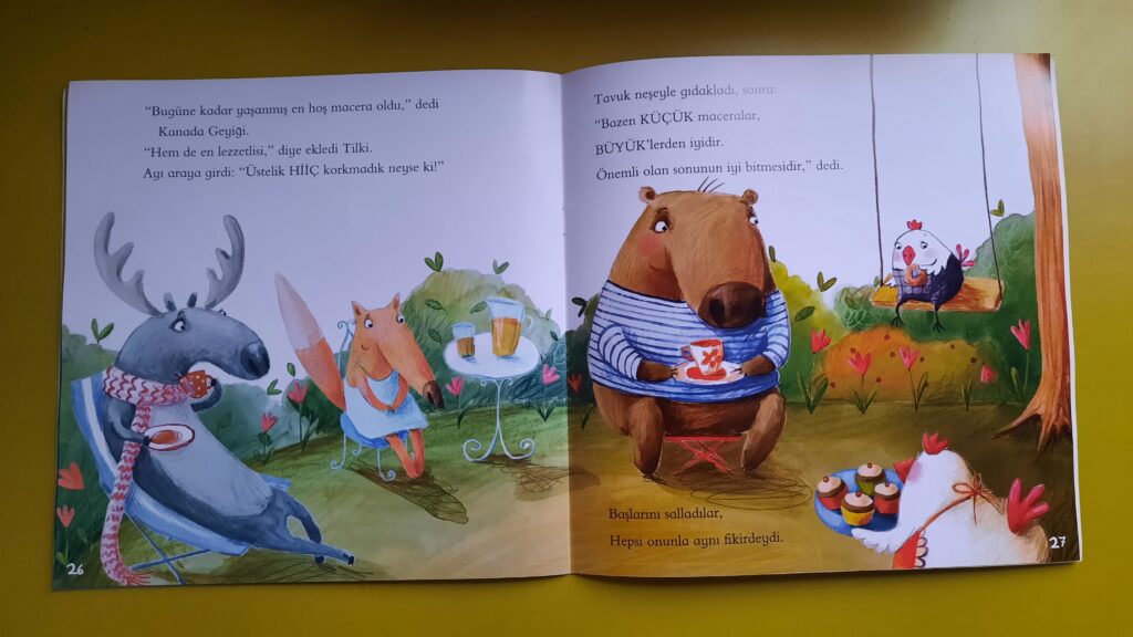 Arka Kapak Yazısı: Ayı, Tilki ve Kanada geyiği gerçekten BÜYÜK bir macera yaşamak istiyorlar. Planlar yapıyorlar – Afrika’ya mı gitsek, yoksa Kuzey Kutbu’na mı? Yoo, Ay’a gidelim! Ama büyük maceralar büyük hazırlıkları gerektirir ve bazen ürkütücü olabilirler. Neyse ki Tavuk var yanlarında! Onun aklından daha farklı bir macera türü geçiyor.