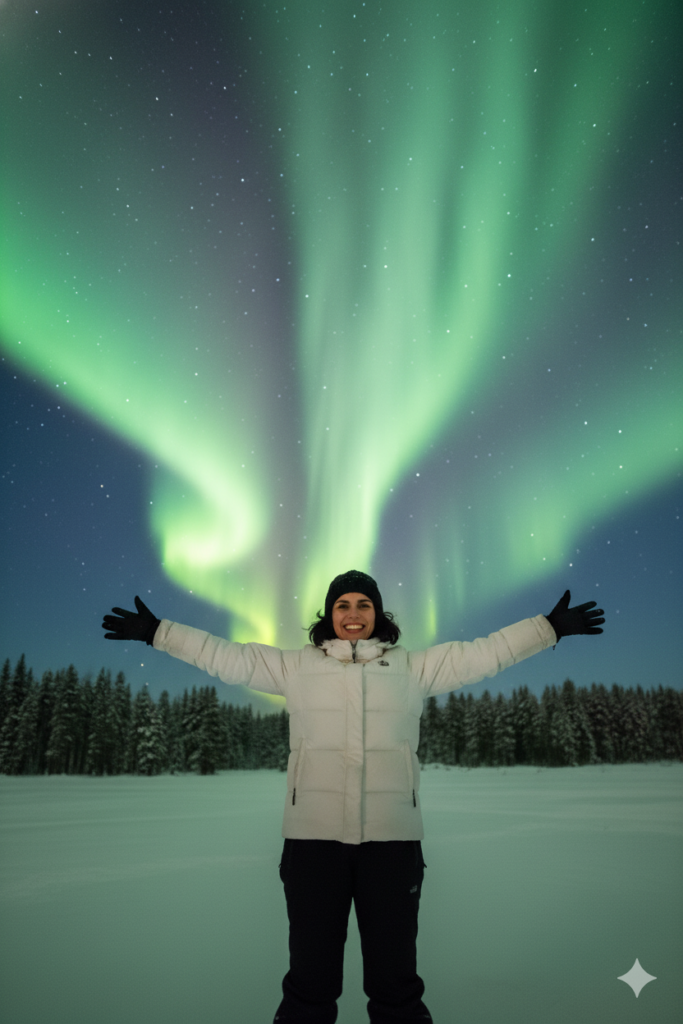 1- Create an ultra realistic high detail night scene featurin g this person standing joyfully on a snowy landscape under a vibrant aurora. Maintain the facial structure and overall likeness of this person. Outfit should include a white winter jacket, black snow pants, gloves, and a beanie. This person smiles brightly with arms stretched out in excitement. The sky should display s weeping neon green and soft yellow aurora waves across a starry night. Include a dark pine tree line on the horizon. The aurora should cast a soft atmospheric glow on the snow and clothing, Preserve natural colors, sharp detail, and a cinematic winter mood.