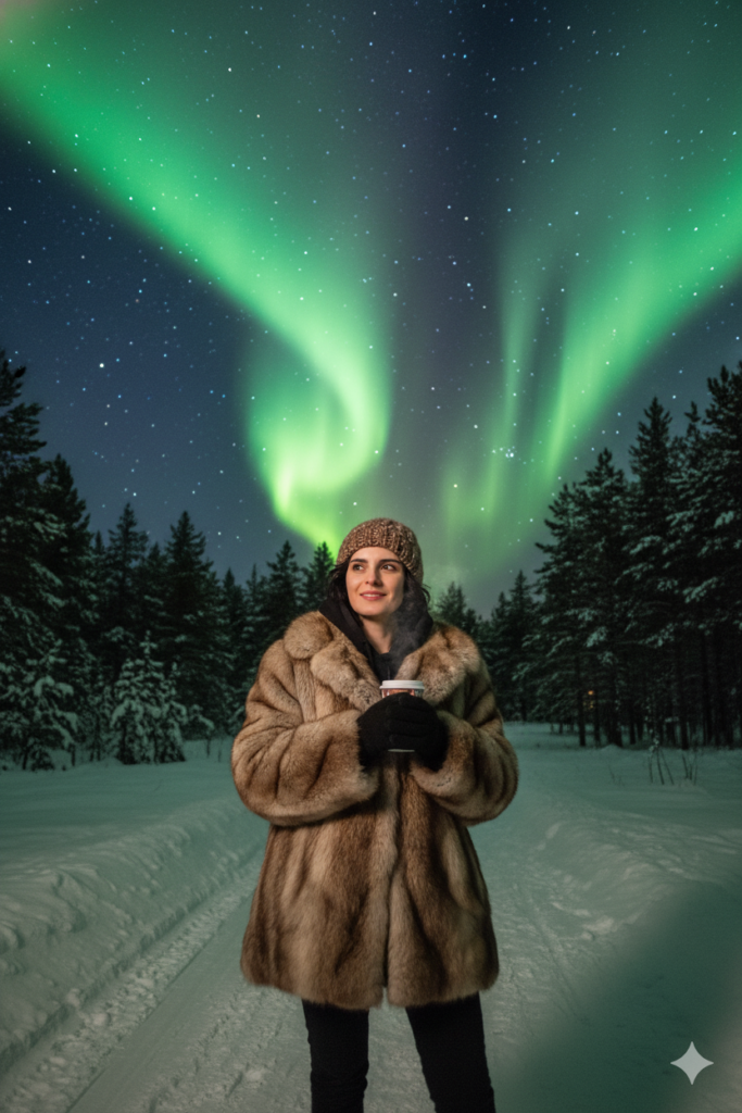 2- Create an ultra realistic high detai winter scene featuring this person standing on a snowy pathway surrounded by dark pine trees under a bright green aurora. Keep the facial structure and overall likeness of this person. Outfit should include a thick oversized fur coat, a hooded laver, and a knittec beanie. This person holds a warm drink cup and gives a soft warm smile. The sky should be clear with visible stars. The northern lights should cast a gentle green gow over rthe scene. Maintain, a serene and magical atmosphere with natural lighting and clean integration of this person into the environment.