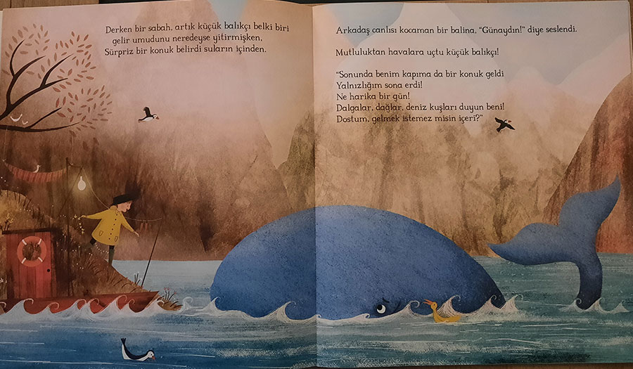 Küçük bir adada tek başına yaşayan minik bir balıkçının, her gün denize açılıp balık tutarken bir yandan da gelecek bir misafiri umutla beklemesini anlatan bir hikâye. Hem yalnızlık hem merak duygusu hem de açgözlülük kavramları bir arada.