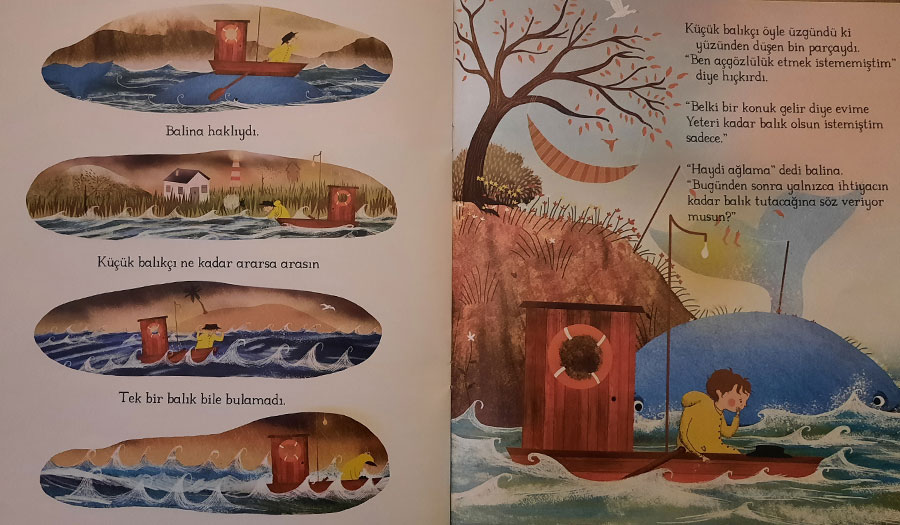 “Küçük balıkçı sadece kendi ihtiyacı kadar balık tuttuğu için bu defa yeni arkadaşlarının karnını doyurmaya yetecek kadar balık kalmıştı geride.”